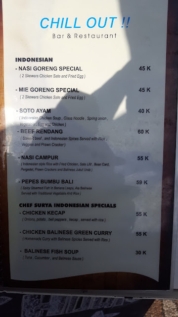 Az árakban a "K" ezret jelent, vagyis az az étel, amit ettem, 55 000 rúpia volt. Mivel 1000 rúpia nem egészen 22 Ft, ez nem volt több mint 1200 Ft. Az ital hozzá még 35 000 rúpiába került, vagyis borravalóval és mindennel együtt 100 000 rúpiát, azaz 2200 Ft-ot fizettem.